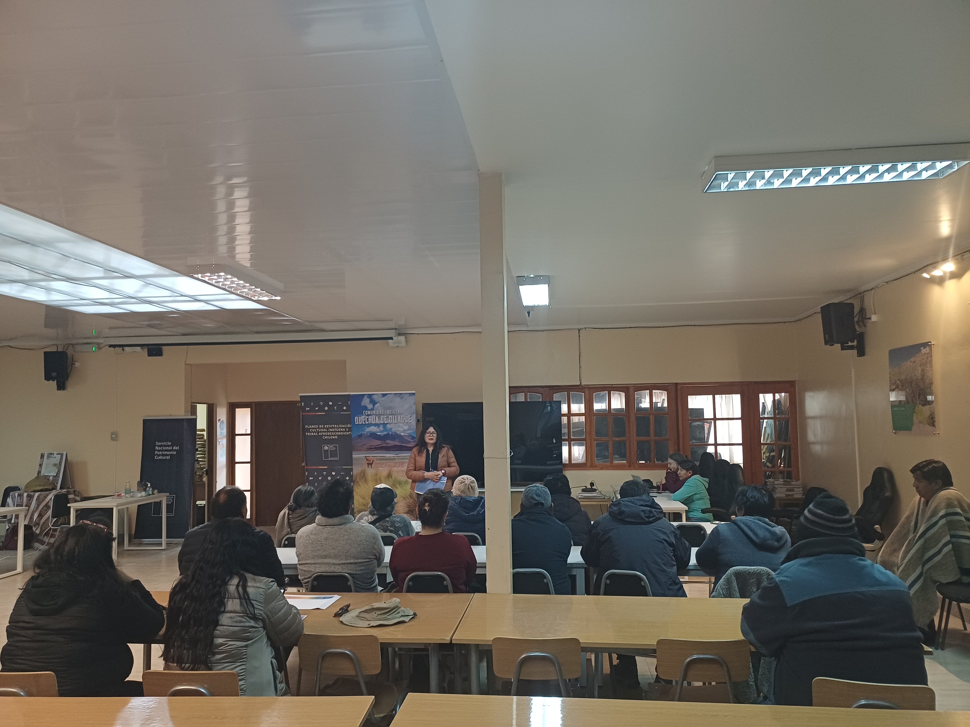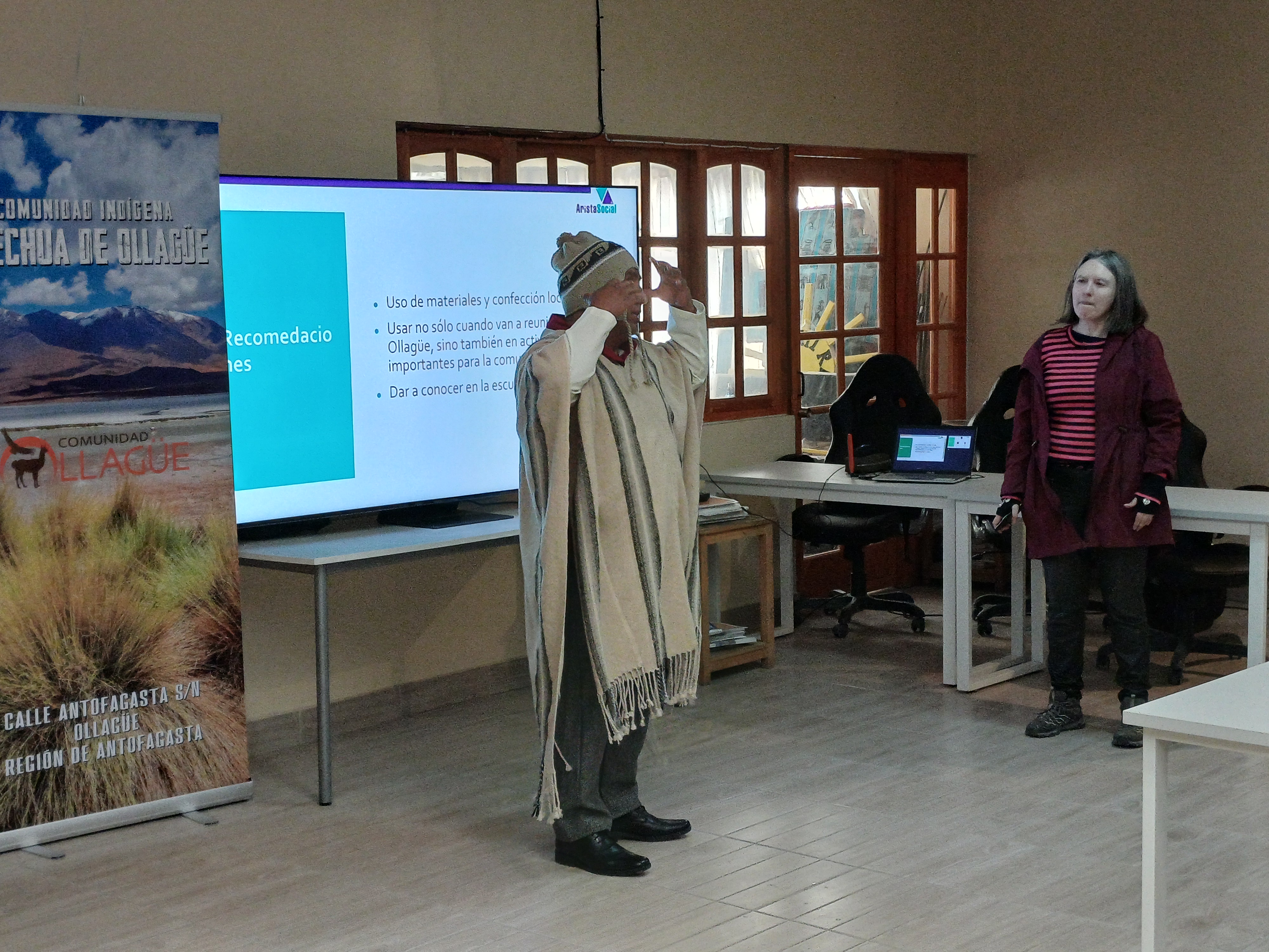 La iniciativa incluyó dos momentos: primero, una presentación sobre la evolución de la vestimenta tradicional de este pueblo, a cargo de la antropóloga Marcela Romo, asesora de la Comunidad Indígena Quechua de Ollagüe y quien lideró el proceso de investigación participativa con comuneras y comuneros realizado con anterioridad en el territorio.