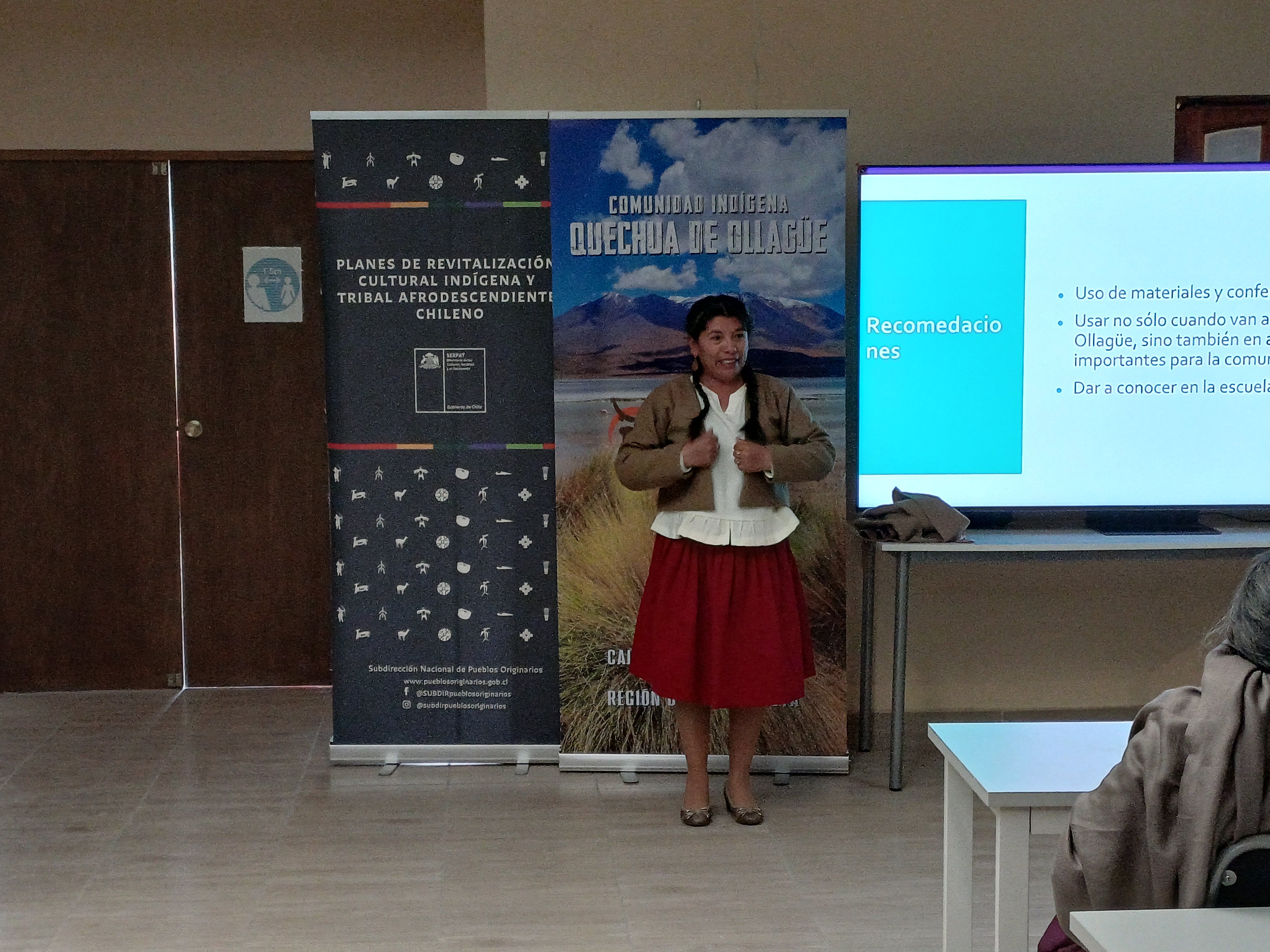 Con la presencia de comuneras y comuneros de la Comunidad Indígena Quechua de Ollagüe, los miembros de su directiva, encabezados por Víctor Nina, Ruth Vilches, Lidia Mendoza y Carmen González, cultoras textiles y profesionales de la Subdirección Nacional de Pueblos Originarios y Tribal Afrodescendiente chileno (Subpoa) del Servicio Nacional del Patrimonio Cultural (Serpat) de la Región de Antofagasta, el pueblo Quechua de esta comuna presentó su vestimenta tradicional y desarrolló un conversatorio en torno a esta temática.
