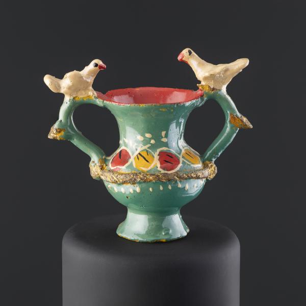 (Atribuida a) Sara Guitérrez. Vasija en miniatura con dos asas, aves y banda acordonada. Primer tercio del siglo XX. Arcilla modelada, cocida, policromada y dorada. 28,62 x 31,04 x 16,67 mm. Colección de Artes Populares y Artesanías, Museo de Historia Natural de Valparaíso. N.º inv. 2396. Fotografía: Juan Pablo Turén.