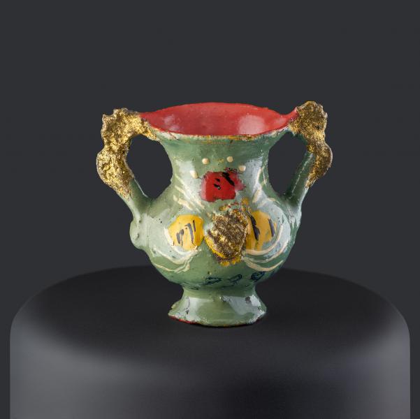 (Atribuida a) Sara Guitérrez. Vasija en miniatura con dos asas polilobuladas y borde ondeado. Primer tercio del siglo XX. Arcilla modelada, cocida, policromada y dorada. 24,05 x 24,37 x 15,21 mm. Colección de Artes Populares y Artesanías, Museo de Historia Natural de Valparaíso. N.º inv. 2397. Fotografía: Marisol Toledo.