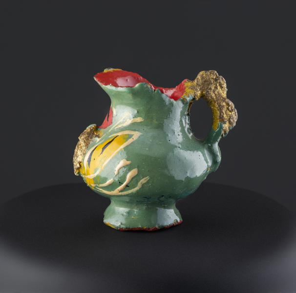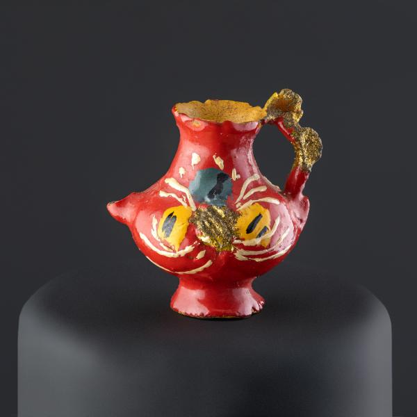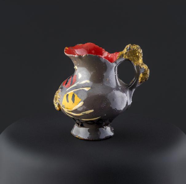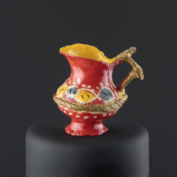 (Atribuida a) Sara Guitérrez. Jarro en miniatura con asa polilobulada y dorada. Primer tercio del siglo XX. Arcilla modelada, cocida, policromada y dorada. 19,91 x 14,05 x 10,48 mm. Colección de Artes Populares y Artesanías, Museo de Historia Natural de Valparaíso. N.º inv. 2405. Fotografía: Juan Pablo Turén.
