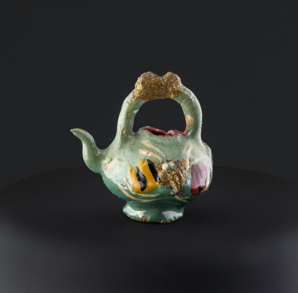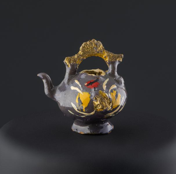 (Atribuida a) Sara Gutiérrez. Tetera pichel en miniatura con asa polilobulada y dorada, y pico faltante. Primer tercio del siglo XX. Arcilla modelada, cocida, policromada y dorada. 22,46 x 20,66 x 18,21 mm. Colección de Artes Populares y Artesanías, Museo de Historia Natural de Valparaíso. N.º inv. 2402. Fotografía: Juan Pablo Turén.