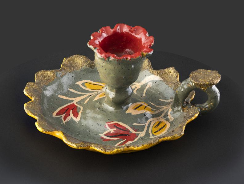(Atribuida a) Sara Gutiérrez. Palmatoria en miniatura con asa dorada y bordes ondeados. Primer tercio del siglo XX. Arcilla modelada, cocida, policromada y dorada. 19,94 x 32 x 35,72 mm. Colección de Artes Populares y Artesanías, Museo de Historia Natural de Valparaíso. N.º inv. 2412. Fotografía: Juan Pablo Turén.
