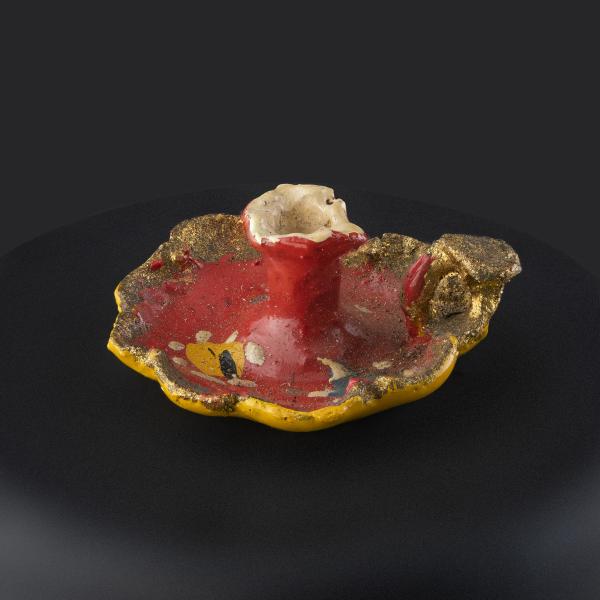 (Atribuida a) Sara Gutiérrez. Palmatoria en miniatura con asa dorada y bordes ondeados. Primer tercio del siglo XX. Arcilla modelada, cocida, policromada y dorada. 6,23 x 10 x 13,25 mm. Colección de Artes Populares y Artesanías, Museo de Historia Natural de Valparaíso. N.º inv. 2413. Fotografía: Juan Pablo Turén.