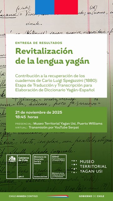 El director regional del Serpat, Pablo Quercia, se encuentra en Puerto Williams desde este miércoles para encabezar las celebraciones de este importante aniversario. Destacó especialmente la presentación del producto final del proyecto “Contribución a la recuperación de los cuadernos de Carlo Luigi Spegazzini (1880): Etapa de Traducción y Transcripción para Elaboración de Diccionario Yagán-Español”, agendada para las 18: 45 horas: "Esta iniciativa, impulsada por el Ministerio de Desarrollo Social y Familia, a través de la Unidad de Coordinación de Asuntos Indígenas y Afrodescendientes de la Subsecretaría de Servicios Sociales, y la Dirección Regional de Magallanes y de la Antártica Chilena del Servicio del Patrimonio Cultural, en el marco del Decenio de las Lenguas, revitaliza la lengua yagan mediante la transcripción y traducción de manuscritos del naturalista italiano Carlo Luigi Spegazzini, recuperados del Anthropos Institut en Alemania por la investigadora Cristina Zárraga Riquelme, quien realizó este proyecto junto con el investigador Javier Domingo".