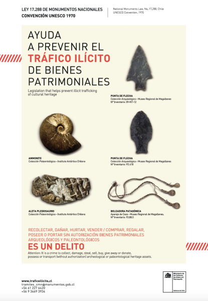 El patrimonio arqueológico y paleontológico se encuentra protegido a nivel nacional por el solo ministerio de la Ley 17.288 de Monumentos Nacionales. En el ámbito internacional, Chile suscribió en 2013, gracias al trabajo impulsado desde la Mesa Nacional de Lucha contra el Tráfico Ilícito de Bienes Patrimoniales, la “Convención sobre las Medidas que deben adoptarse para prohibir e impedir la Importación, la Exportación y la Transferencia de Propiedad Ilícitas de Bienes Culturales” de la Unesco, Paris-1970. Este instrumento jurídico, dedicado a la lucha contra el tráfico ilícito de bienes culturales, entiende por tráfico ilícito de bienes patrimoniales, la apropiación indebida, robo, hurto y receptación, así como la importación y exportación ilegal de bienes patrimoniales, que contravienen la legislación y causan daño irreparable a la memoria y el legado de un país.