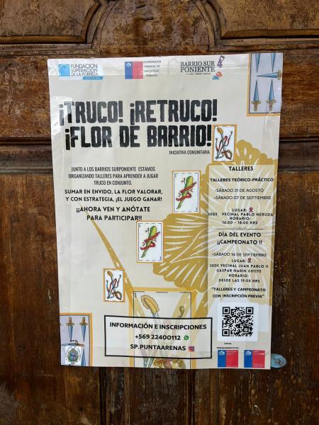 La entrega se produjo en el marco de la segunda jornada del taller "Truco, Retruco... Flor de Barrio!" organizado por el Serpat, el Programa Servicio País y la agrupación interbarrial "Barrios Surponiente" de Punta Arenas. Los encuentros se iniciaron el pasado 31 de agosto, consistiendo en dos talleres teóricos-prácticos sobre el truco destinados a los vecinos y vecinas de Punta Arenas, además de una tercera sesión de cierre donde se efectuará un campeonato y actividad artística.