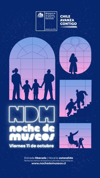 Posteriormente, se realizará la Noche de Museos (11 de octubre), con el objetivo de fomentar la participación gratuita de la ciudadanía en actividades culturales, como visitas a museos, espacios museales, galerías de arte y recorridos patrimoniales en horario extendido a partir de las 17:00 horas. Hace unos días la iniciativa fue lanzada por la ministra de las Culturas, las Artes y el Patrimonio, Carolina Arredondo, en el Museo de Artes Visuales MAVI UC, ubicado en el Barrio Lastarria en Santiago. Hasta el 8 de octubre estará disponible la plataforma de inscripción de actividades en www.nochedemuseos.cl, que también será el principal canal de difusión del evento. También se encuentra a disposición de los interesados un Kit Digital editable para elaborar piezas gráficas de promoción de actividades.