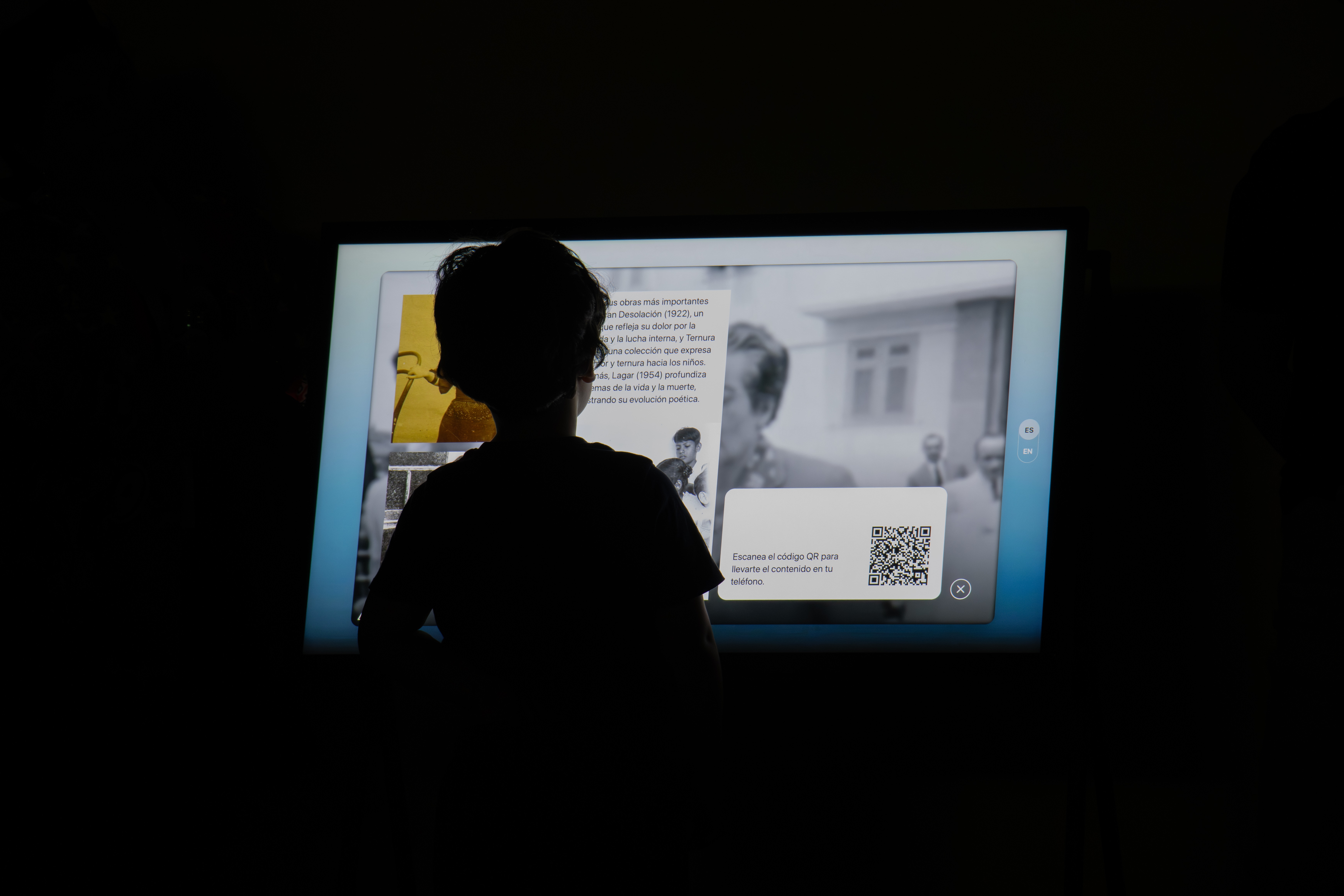 La exhibición incorpora además una pantalla táctil donde las y los visitantes pueden navegar por contenidos ampliados, prolongando la experiencia más allá del espacio físico.