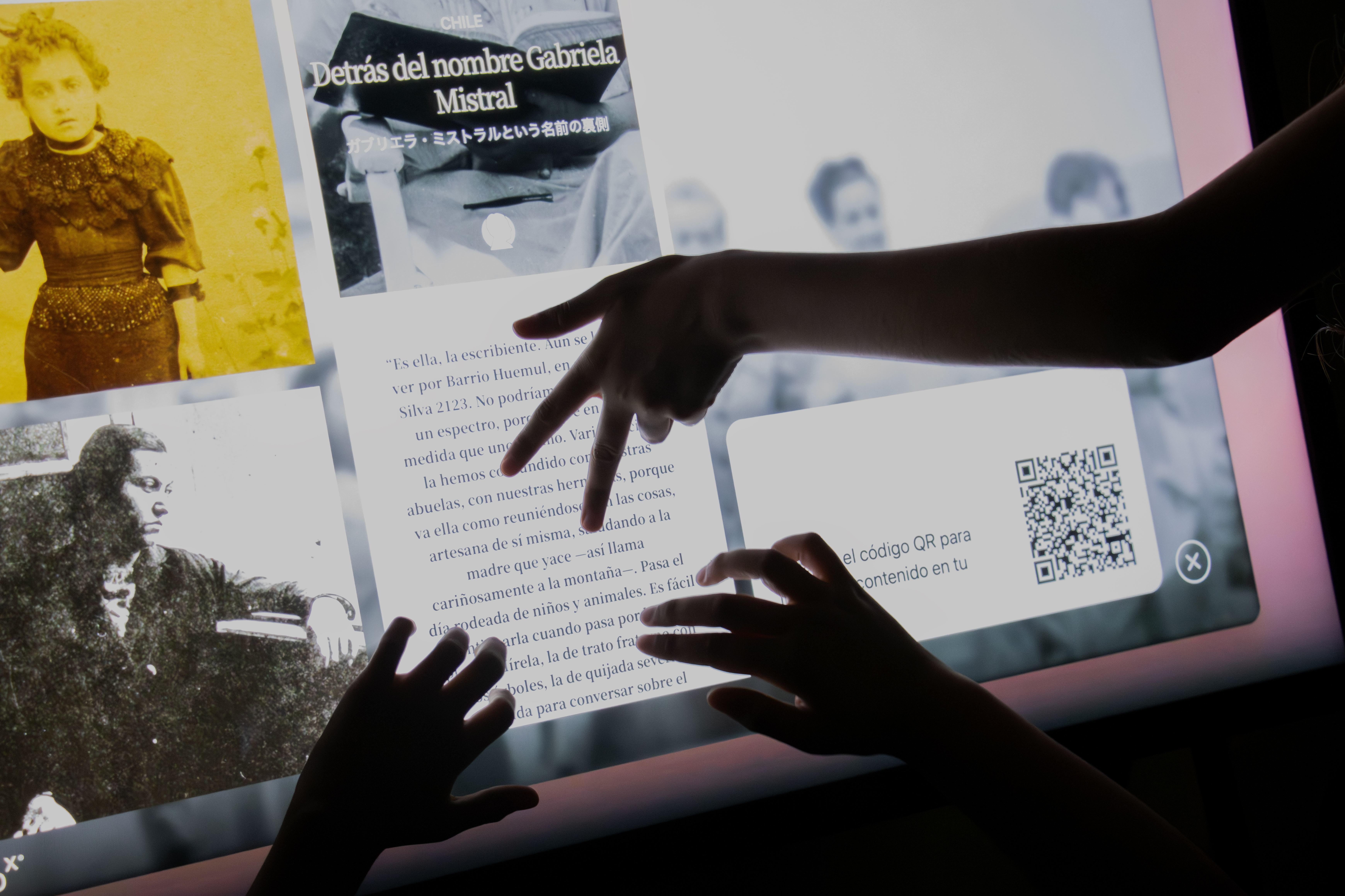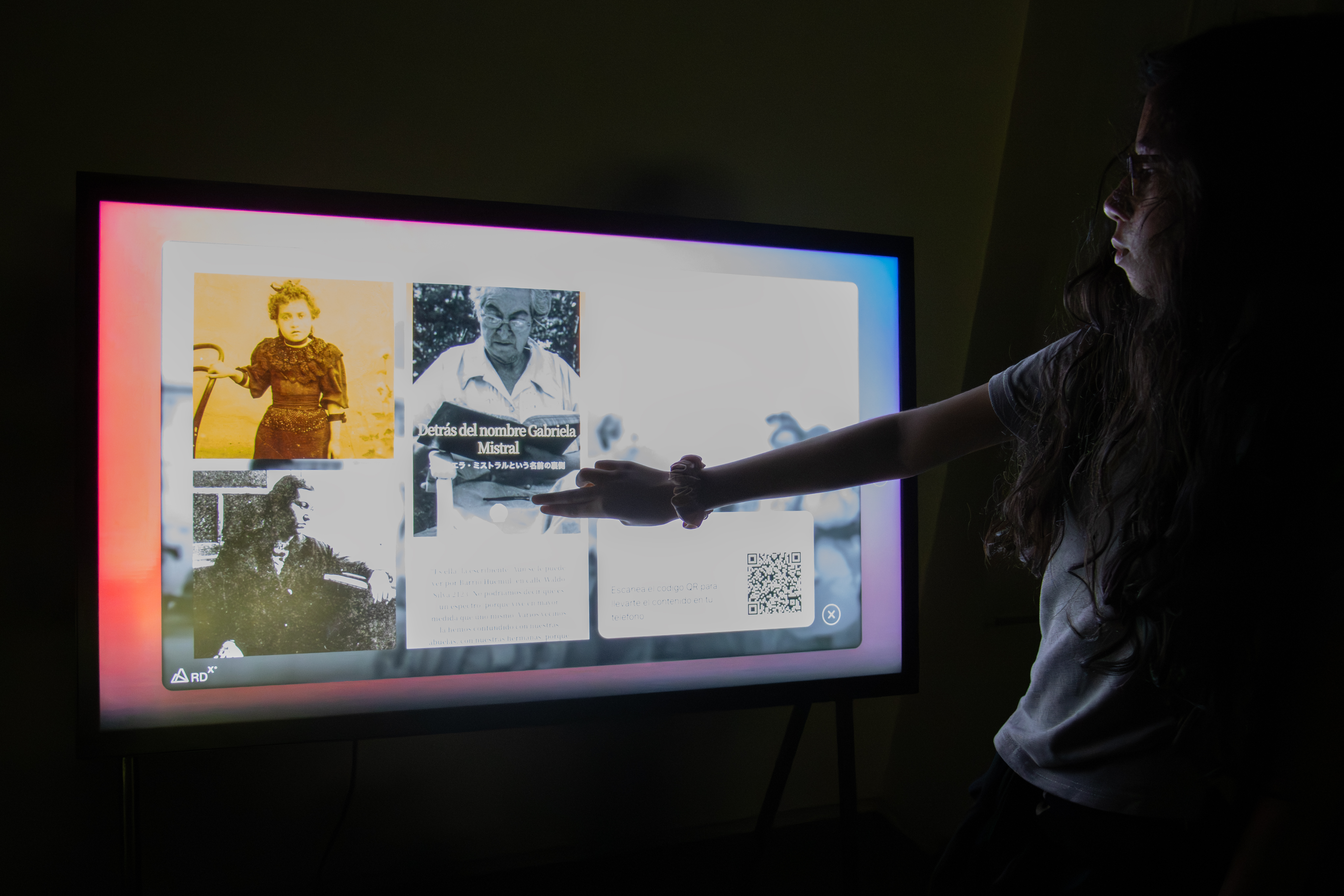 La exhibición incorpora además una pantalla táctil donde las y los visitantes pueden navegar por contenidos ampliados, prolongando la experiencia más allá del espacio físico.