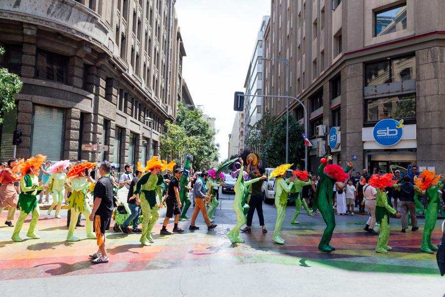 A ello se sumó el “Pasacalle de las flores”, dirigido por José Vidal & Compañía, que reunió a más de 3.000 personas en su recorrido por el centro de Santiago.