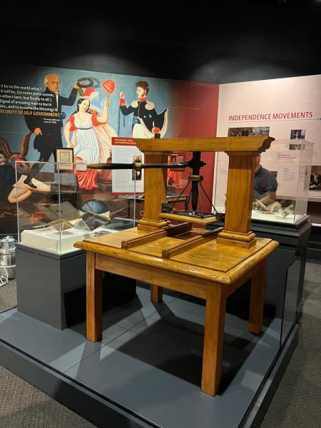La imprenta, considerada un ícono del patrimonio cultural chileno, fue enviada originalmente desde Nueva York en 1811 por simpatizantes estadounidenses liderados por John R. Livingston, hermano de Robert R. Livingston, miembro del comité redactor de la Declaración de Independencia. Su presencia en la exposición simboliza los lazos históricos entre los procesos independentistas de ambos países y el valor universal de la libertad y la soberanía.