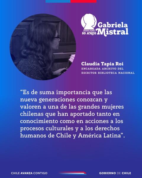 En tanto, para Claudia Tapia, desde su trabajo en el Archivo del Escritor en la Biblioteca Nacional como custodio de su legado, el trabajo de acercar el pensamiento y escritura de Mistral a las nuevas generaciones plantea grandes desafíos. “La conservación de su legado implica un constante compromiso en resguardar íntegramente su obra y protegerla, además es muy importante continuar con el trabajo de difusión. Es de suma importancia que las nuevas generaciones conozcan y valoren a una de las grandes mujeres chilenas que han aportado tanto en conocimiento como en acciones a los procesos culturales y a los derechos humanos no solo de nuestro país sino también en América Latina”.