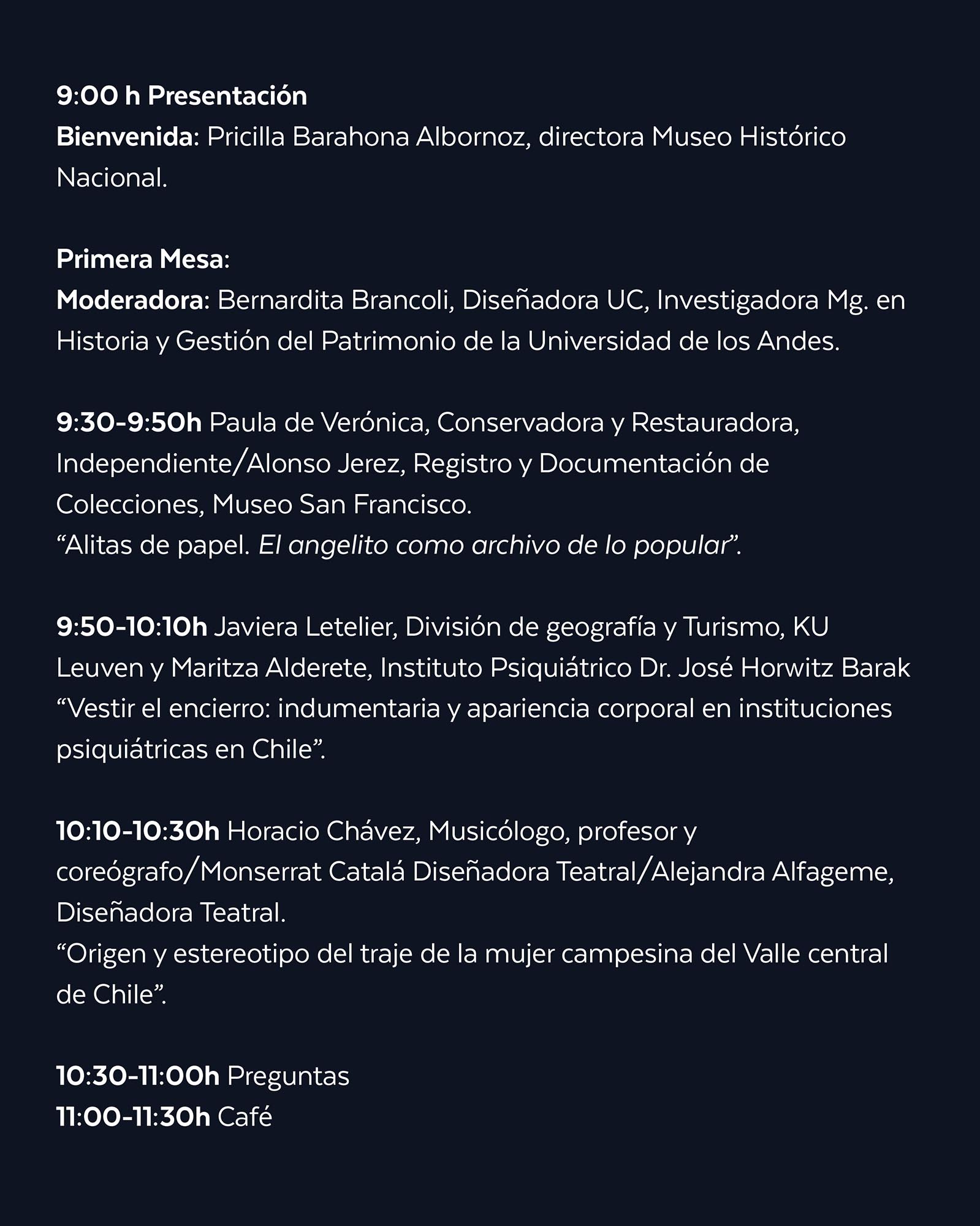 15:00 a 16:30 h. Visita guiada de Isabel Cruz en el Museo San Francisco. Oportunidad única para acercarse a la pintura colonial desde la perspectiva que ella misma desarrolló de manera pionera en Chile en su libro de 1996 "El traje: transformaciones de una segunda piel".