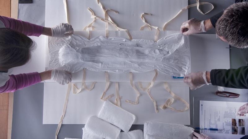 Para el armado de este embalaje se seleccionó una serie de materiales comúnmente usados en el área de la conservación -como el ethafoam y el tyvek- y se moldeó la figura de la momia en la cara posterior y en el contorno para impedir así el desplazamiento del cuerpo. Este contenedor tipo sarcófago, con características ergonométricas se reforzó además con cojines de tyvek rellenos con napa.