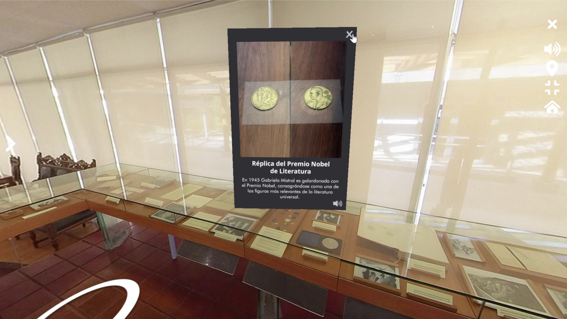 Todos los puntos se visualizan en 360° y desde el inicio en un plano con círculos azules que van indicando en qué salas y rincones del espacio se encuentran los y las visitantes, mientras que durante el recorrido son círculos blancos que permiten el desplazamiento por este espacio patrimonial.Una excelente alternativa para complementar el recorrido virtual y sumergirse en la vida de esta mujer icónica que marcó la historia de nuestro país, son las colecciones digitales que se han desarrollado para aproximar a la Gabriela educadora, a la Gabriela diplomática y a la Gabriela viajera y observarla desde sus principales hitos de vida.