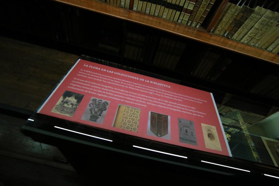 Se pueden ver asimismo libros y fotografías de la colección de la Biblioteca Patrimonial, entre los que destaca, por ejemplo, el uso recurrente de representaciones florales en el encuadernado de las antiguas publicaciones.