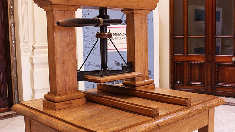En un silencio que no delata su linaje, al ingreso a la Biblioteca Nacional, por el pórtico de Alameda, se exhibe la prensa donde el padre del periodismo nacional, fray Camilo Henríquez, imprimió 62 ediciones de La Aurora de Chile, el primer periódico del país (todos los ejemplares están en la Biblioteca Nacional).