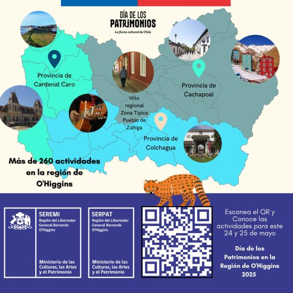 Súmate a la fiesta cultural de Chile y celebremos el Día de los Patrimonios, escaneando el código QR que está  en la parte inferior de la imagen, para que puedas conocer todas las actividades de nuestra región. ¡¡Te esperamos!!