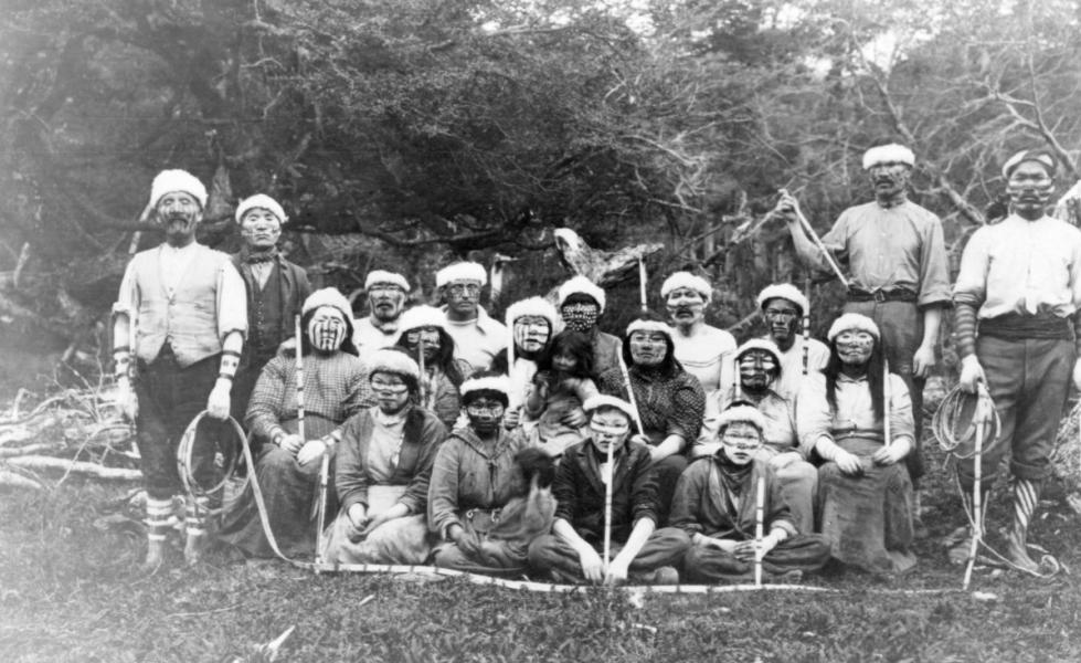 Mujeres y hombres participantes en la ceremonia de iniciación del Chiejaus, realizada en Bahía Mejillones, Isla Navarino en 1922.