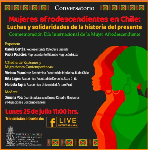 También, hoy, pero a las 11:00, se realizará el conversatorio online "Mujeres afrodescendientes en Chile: luchas y solidaridades de la historia del presente", a través del Facebook Live de la Vicerrectoría de Extensión y Comunicaciones de la Universidad de Chile.