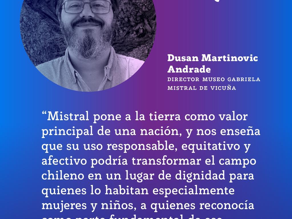 Vinculado a la idea del entorno, para Dusan Martinovic, uno de los grandes aportes de Mistral es su mirada sobre la vida de campo, reflexiones que están plenamente vigentes. “Mistral pone a la tierra como valor principal de una nación, y nos enseña que su uso responsable, equitativo y afectivo podría transformar el campo chileno en un lugar de dignidad para quienes lo habitan especialmente mujeres y niños, a quienes reconocía como parte fundamental de ese tejido social”, comenta el director del Museo Gabriela Mistral de Vicuña.