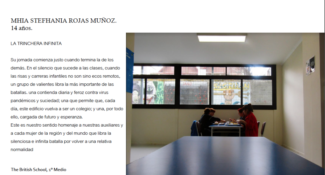 Dada la calidad de los trabajos recibidos, el jurado decidió otorgar dos menciones honrosas a Mhía Rojas Muñoz de The British School y Sofía Valencia Obando del Colegio Charles Darwin. En tanto, el premio de una colección de libros de temática de género y patrimonio fue para la Escuela Pedro Pablo Lemaitre, que registró más participantes, con 35 estudiantes que enviaron sus trabajos al concurso.