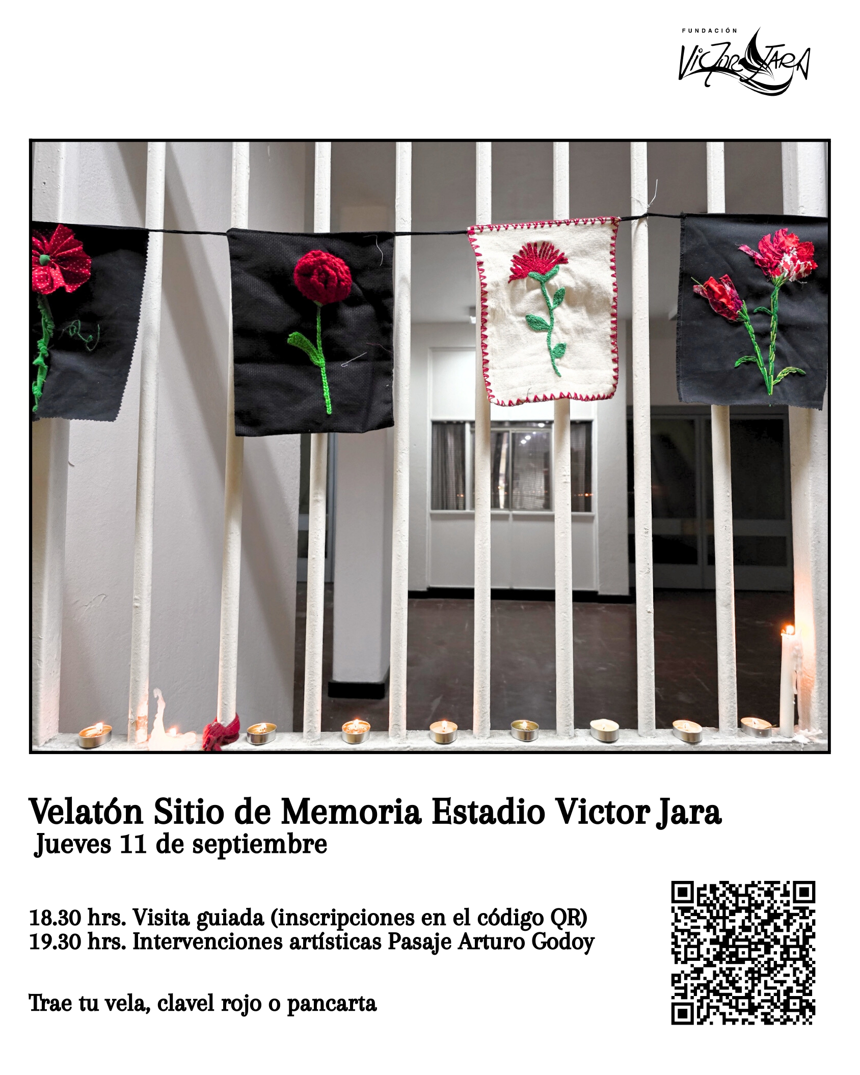 Velatón Sitio de Memoria Estadio Victor Jara. A 52 años del golpe civil-militar seguimos con el compromiso intacto por la memoria, la verdad y la justicia. Defendamos los derechos humanos hoy y siempre para que NUNCA MÁS. Link de inscripción para visita guiada: https://forms.gle/dCbkwNc5QgCJtUtq7 18:30 hrs. Visita guiada 19:30 hrs. Velatón e intervenciones artísticas. Trae tu vela, clavel rojo o pancarta.