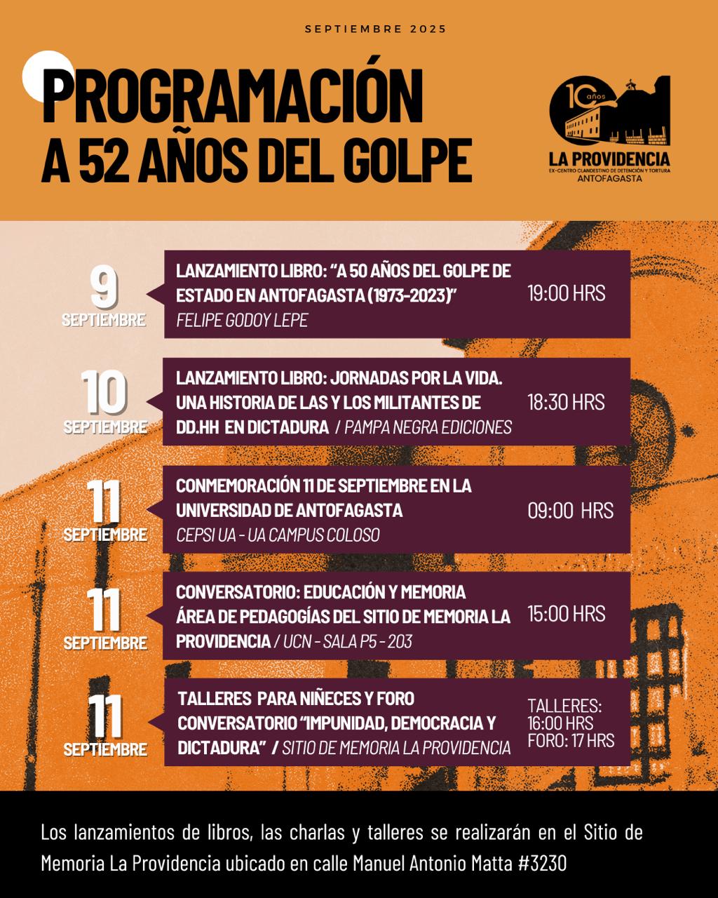 Este 11 de septiembre se cumplen 52 años del golpe de estado civil y militar, contra el gobierno del presidente Salvador Allende. Para conmemorarlo, las organizaciones que integran el Programa Social Sitios de Memoria llevarán a cabo diversas actividades para recordar, reflexionar y transmitir una memoria que permita construir una cultura de respeto a los derechos humanos.