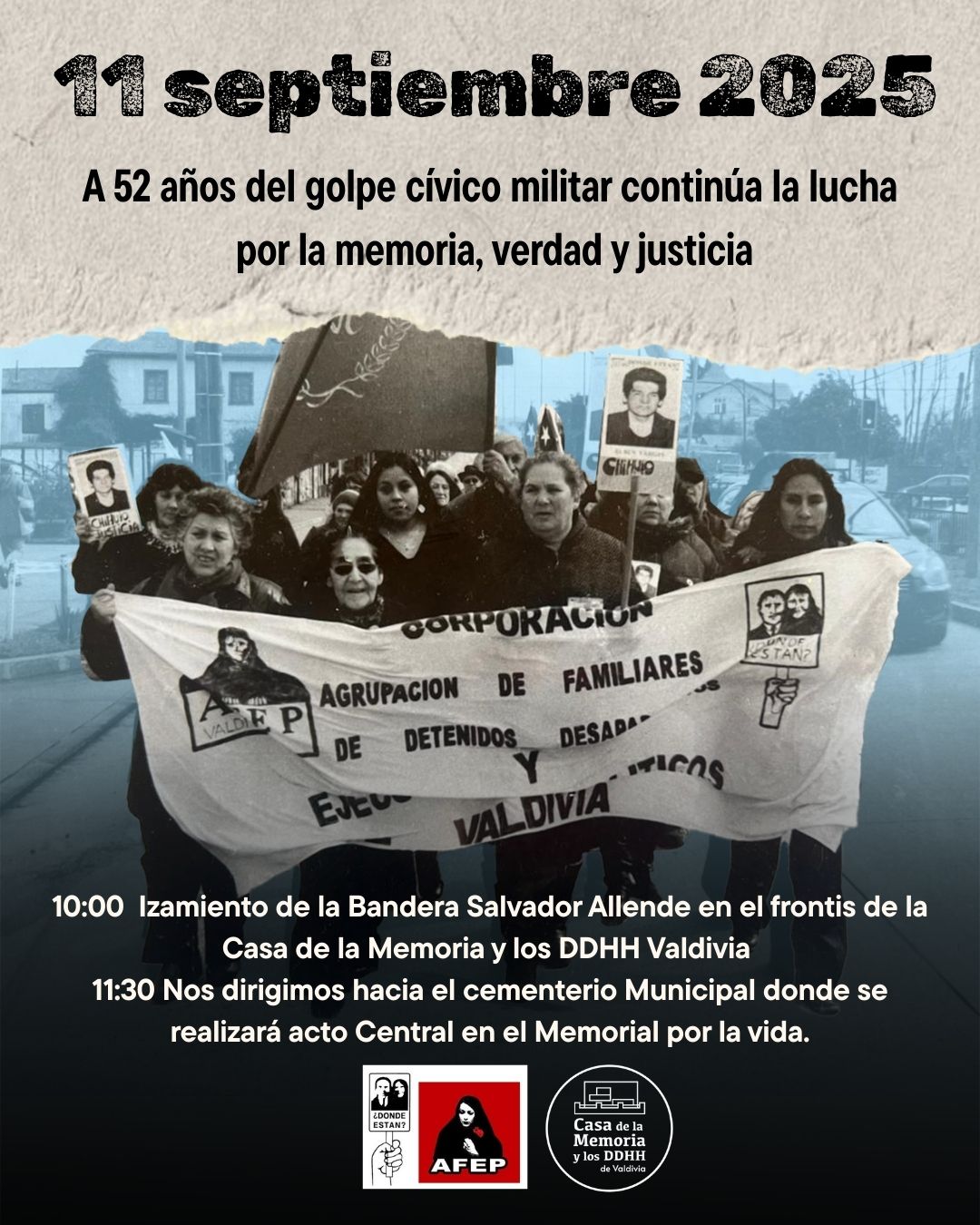 Romería y conmemoración 11 de septiembre. A cincuenta y dos años de los trágicos sucesos que dieron fin al gobierno de la Unidad Popular e instalaron una dictadura Militar que duró 17 años nos volvemos a juntar en nuestro Sitio de Memoria para conmemorar este hecho. A las 10 de la mañana izaremos la bandera Salvador Allende; a las 11.30 iniciaremos la romería hasta el Cementerio Municipal n°1, donde realizaremos un acto en el Memorial por La Vida recordando a todas las víctimas de la dictadura cívico militar. Les invitamos a acompañarnos en esta conmemoración. 11:30 horas, Casa de la Memoria y los DDHH de Valdivia, Vicente Pérez Rosales 764.