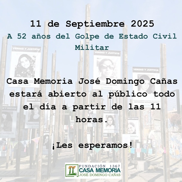 Conmemoración Golpe de Estado en Chile, A 52 años. El 11 de septiembre de 2025, Casa Memoria José Domingo Cañas conmemorará este día abriendo sus puertas desde las 11:00 hrs para procesos de memoria colectiva. Junto a organizaciones de la Articulación de DDHH, se dispondrán espacios temáticos sobre infancia, mujeres, migrantes y otros, vinculando la dictadura con el presente. Durante toda la jornada se realizará el rito de las velas, iluminando las memorias y reafirmando la lucha por verdad, justicia y no repetición.
